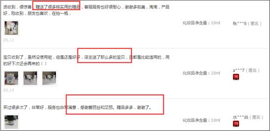 你几乎可以在阿芙店铺里面80%以上的评论里面看到这样的描述:送了很多小赠品、有好多小礼品、非常感谢客服妹妹申请了那么多的小赠品……