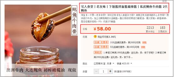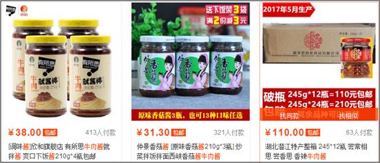 你看第一张图,是常规的牛肉酱,一般情况下,那就大价格战吧,差不多十几块钱一瓶,一般都会三瓶、四瓶、甚至十几瓶这样去卖,这就属于没有溢价元素的。
