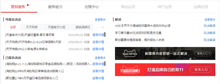 内容中心:整合内容及消息,对平台信息进行及时触达,让商家快速了解天猫动向,掌握各类规则或活动信息。