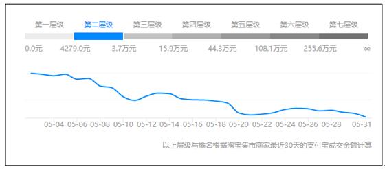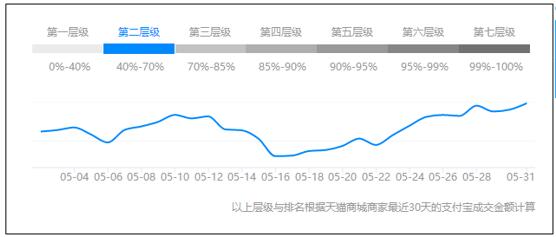 打开你的“生意参谋”,在首页的右侧边栏,你就可以看到你的店铺层级。其中淘宝是按照金额来划分层级的,天猫是按照比例划分层级的。统计的标准都是:最近30天的支付宝成交金额,只不过淘宝跟淘宝比,天猫跟天猫比。所以,你的店铺层级排名跟DSR评分一样,是动态变化的。
