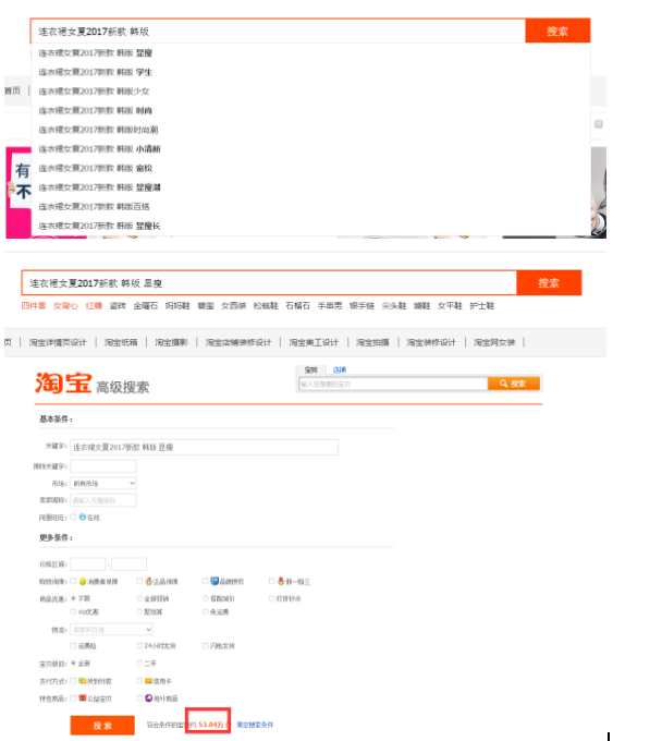 首先在搜索框输入核心词,在搜索框下方就会出现你所输入核心词的系统推荐属性词,天猫代运营可以输入下方符合我们产品的词语继续输入,一直到系统不再推荐为止,接下来将这个词在高级搜索中去搜索,我们就可以知道这个词在市场中有多少对应的宝贝,选择在线商品最少的词组合就好。可能有些喷子会留言:XX,高级搜索没了。我只想说:呵呵。