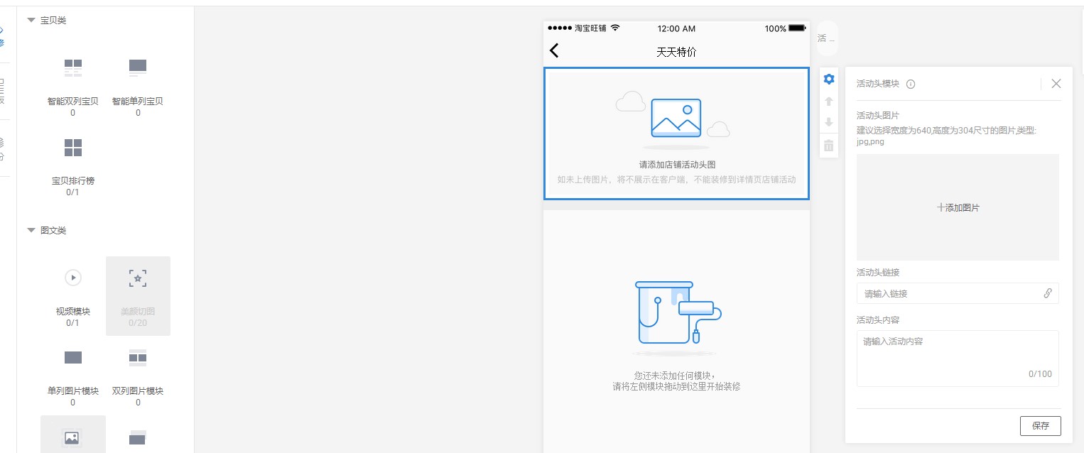 点击活动页面的板块,需要上传一个活动的图片,那么这个图片是展示在详情页里面的,所以图片的清晰度以及尺寸都要提前把控好。下面是添加活动图片的链接,添加得链接可以是宝贝的链接,也可以是分类链接。再下面就是一个文本的内容,因为你是做活动的模块,所以文本的编辑也要独特和吸引人。让买家有想去点击进去的欲望。最后保存发布就可以了。这就是活动模块。